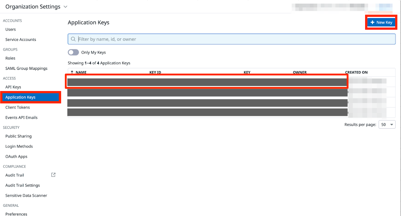 『Application Keys』を押下し『➕New Key』を選択し、Application Key作成します。