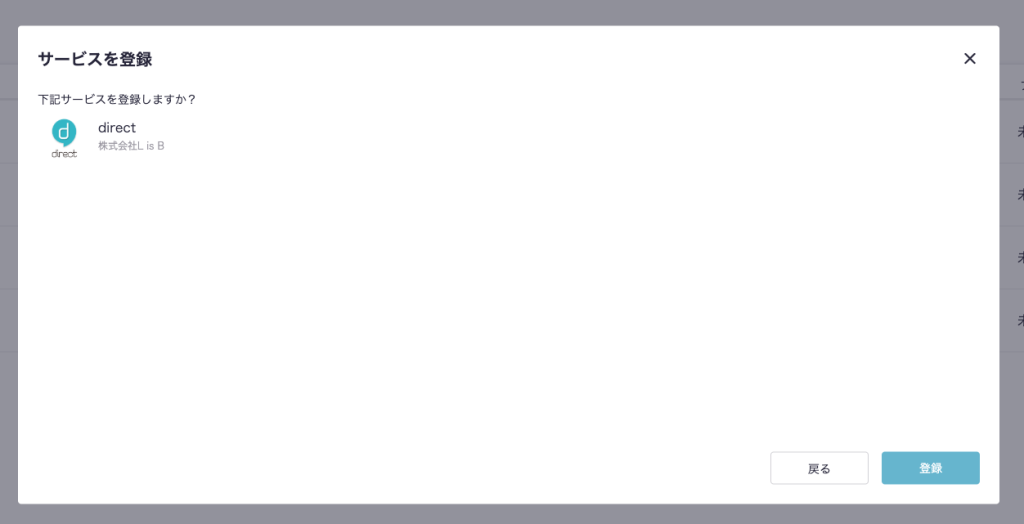 サイドメニューから『サービス』を選択し、『サービスを追加』ボタンを押下します。その後、出現するモーダルの入力欄にサービス名である「direct」と入力します。出てきた検索結果から『direct』を選択します。