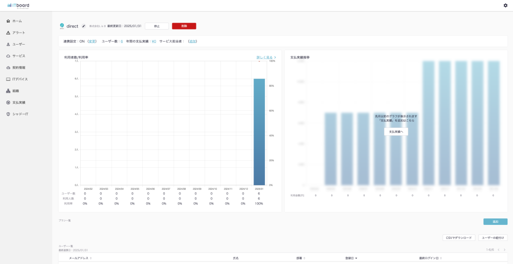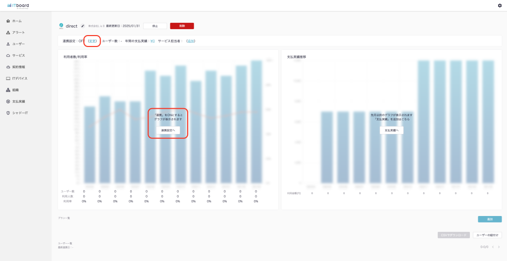 ITboardのサービス詳細画面に戻りますので、そこで「連携設定: ON」になり、「利用者数/利用率」のグラフが見られるようになっていれば、連携成功です。