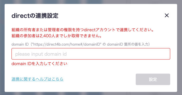先ほど控えたdomain idを入力して「設定」ボタンを押下します。