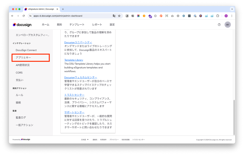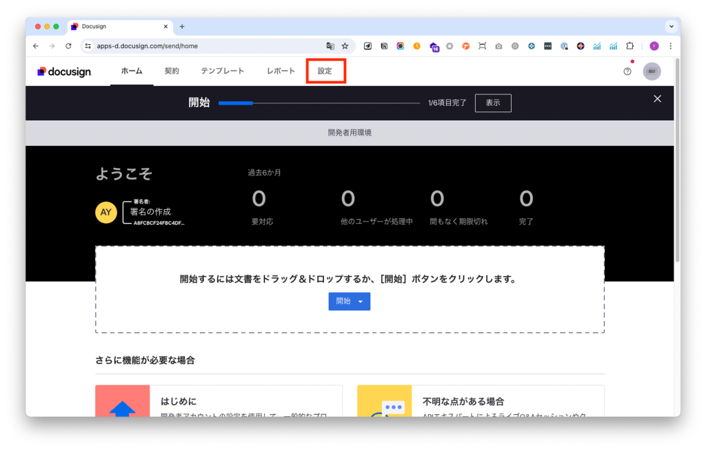 DocuSignに管理ユーザーアカウントでログインし『設定』タブをクリックします。