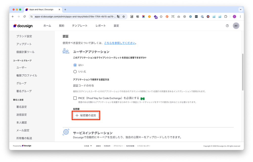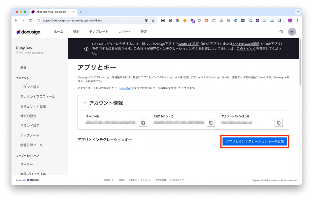 『アプリとインテグレーションキーの追加』ボタンをクリックします。