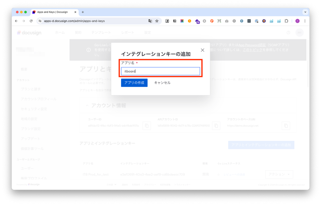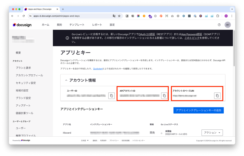 をコピーして手元に保管します。取得したAPIアカウントIDもアカウントのベースURIもITboardとDocuSignとの連携時に必要になります。