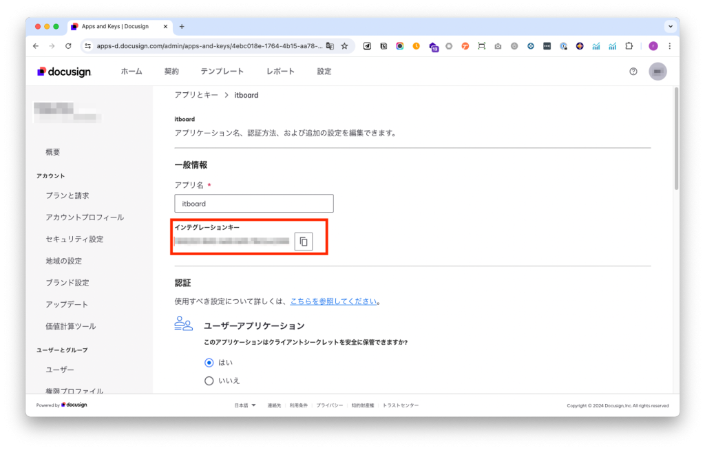 『インテグレーションキー』をコピーして手元に保管します。作成されたインテグレーションキーはITboardとDocuSignとの連携時に必要になります。