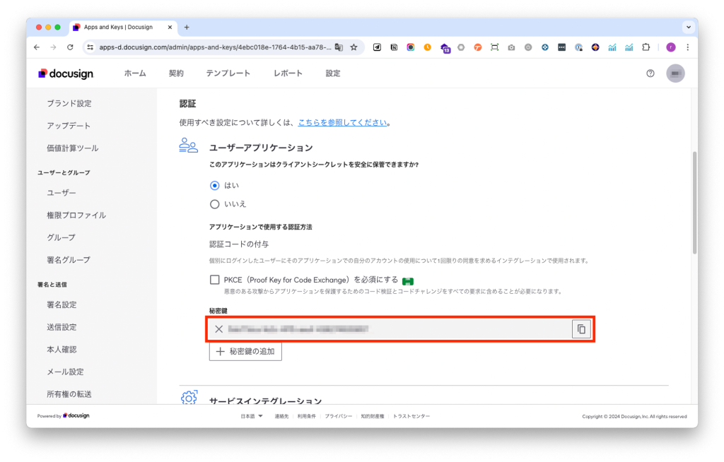 クリックすると『秘密鍵』が生成されて表示されますので、コピーして手元に保管します。作成された秘密鍵もITboardとDocuSignとの連携時に必要になります。