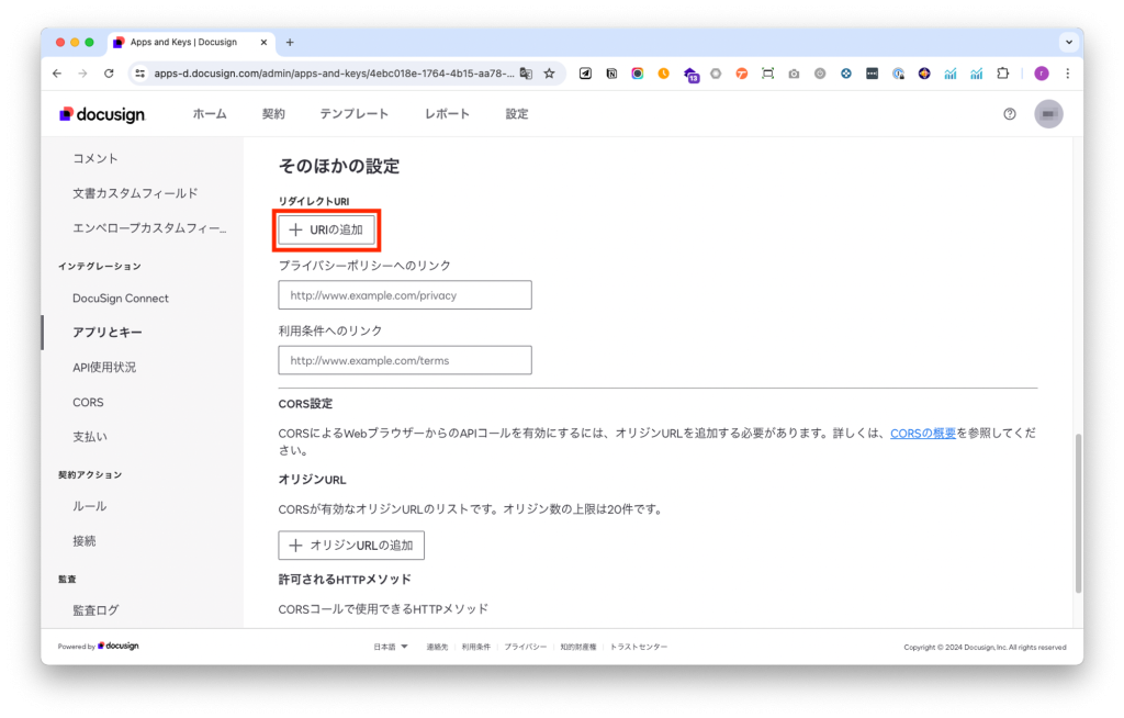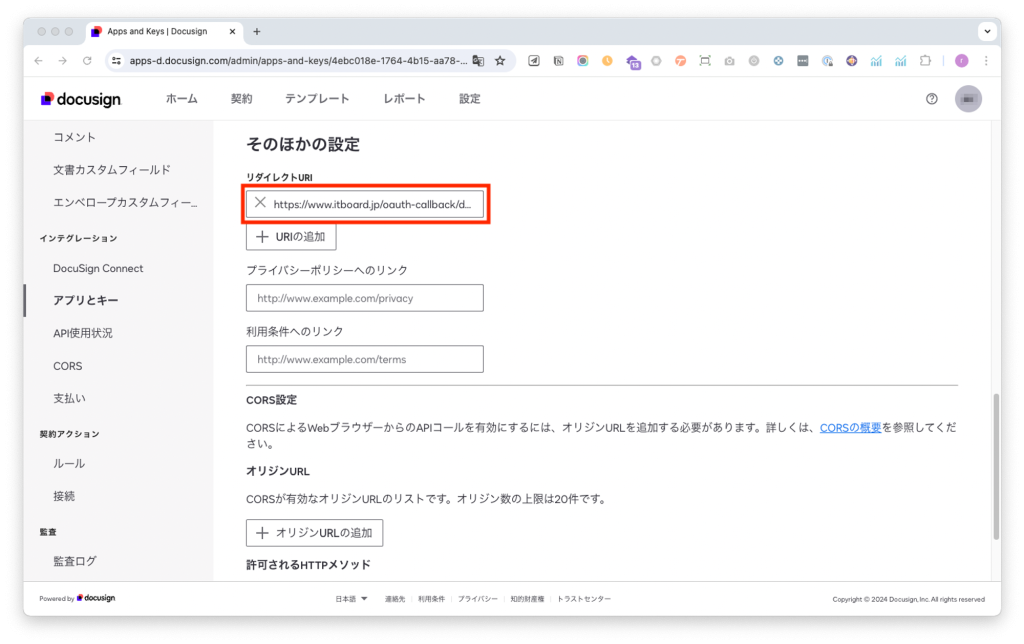 クリックすると「リダイレクトURI」を入力するテキストフィールドが表示されますので『https://www.itboard.jp/oauth-callback/docu-sign』と入力します。