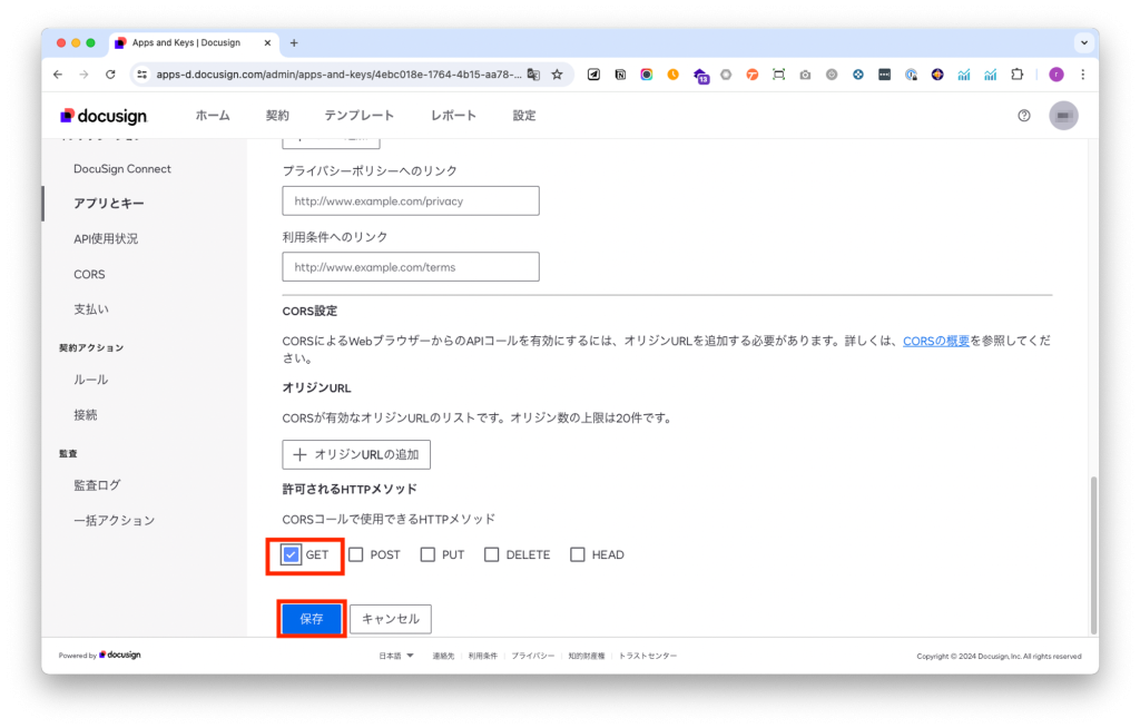 最後に「許可されるHTTPメソッド」エリアにある『☑︎GET』にチェックを入れて、『保存』ボタンをクリックします。