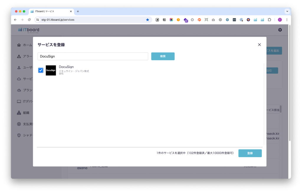 出てきた検索結果から『DocuSign』を選択し、モーダル右下の『登録』ボタンを押下します。