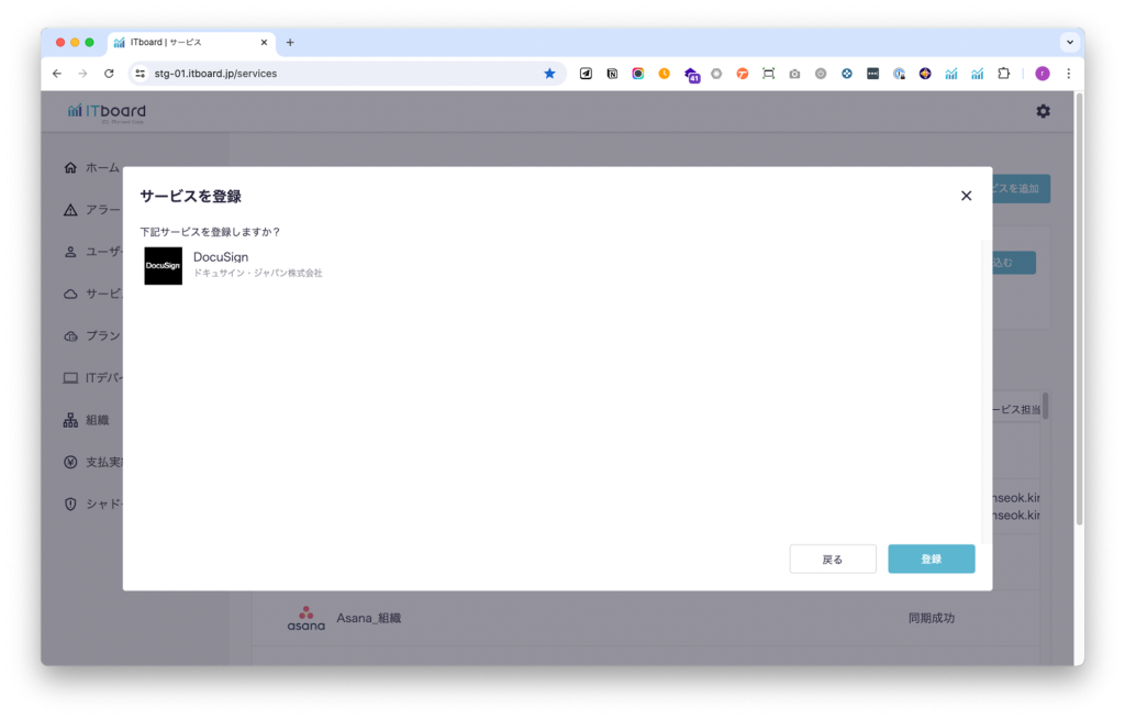 登録確認のモーダルが出現するので選択したDocuSignが表示されていることを確認して、モーダル右下の『登録』ボタンをクリックします。