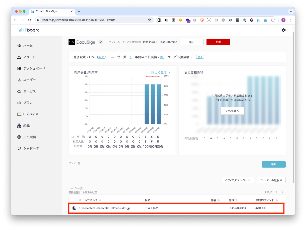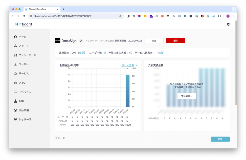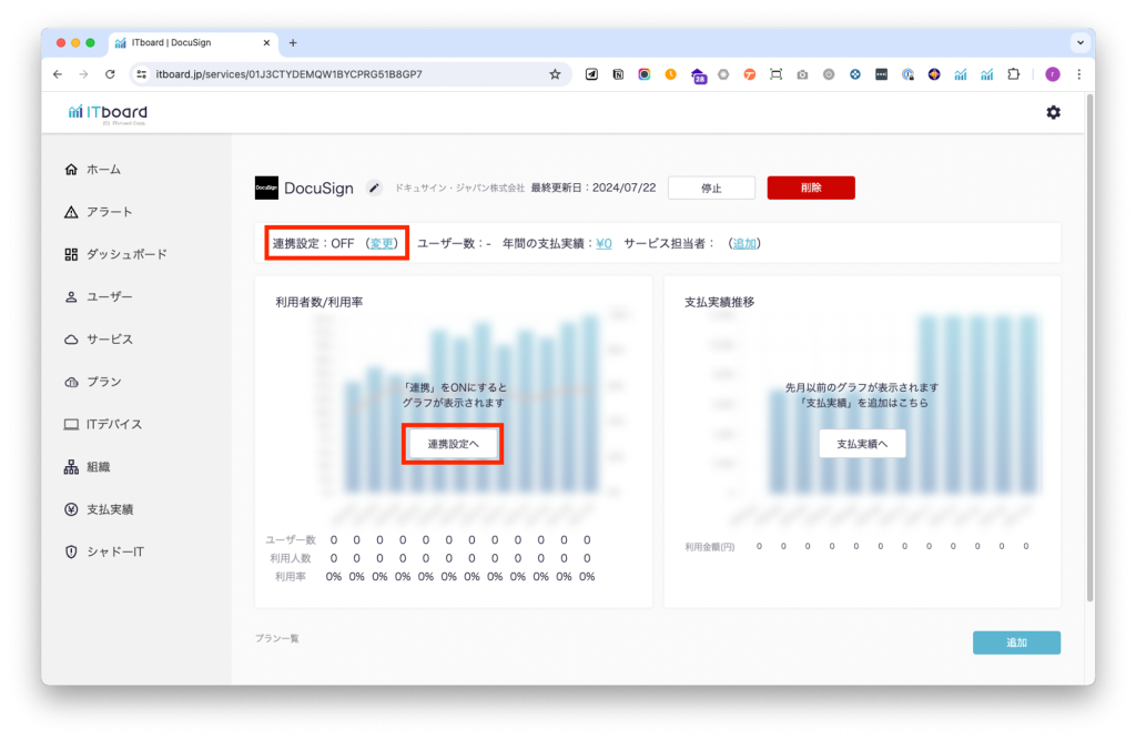 ITboardのサービス詳細画面に戻りますので、そこで「連携設定: ON」になり、「利用者数/利用率」のグラフが見られるようになっていれば、連携成功です。