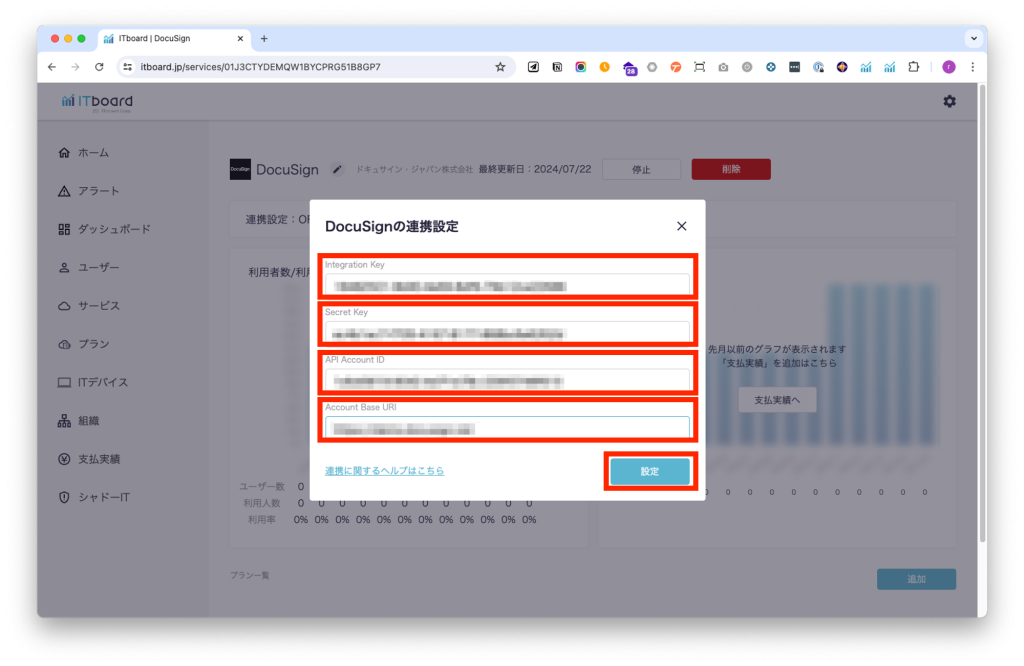 DocuSignの連携設定モーダルが出現するので、「Integration Key」「Secret Key」「API Account ID」「Account Base URI」を入力し『設定』ボタンを押下します。