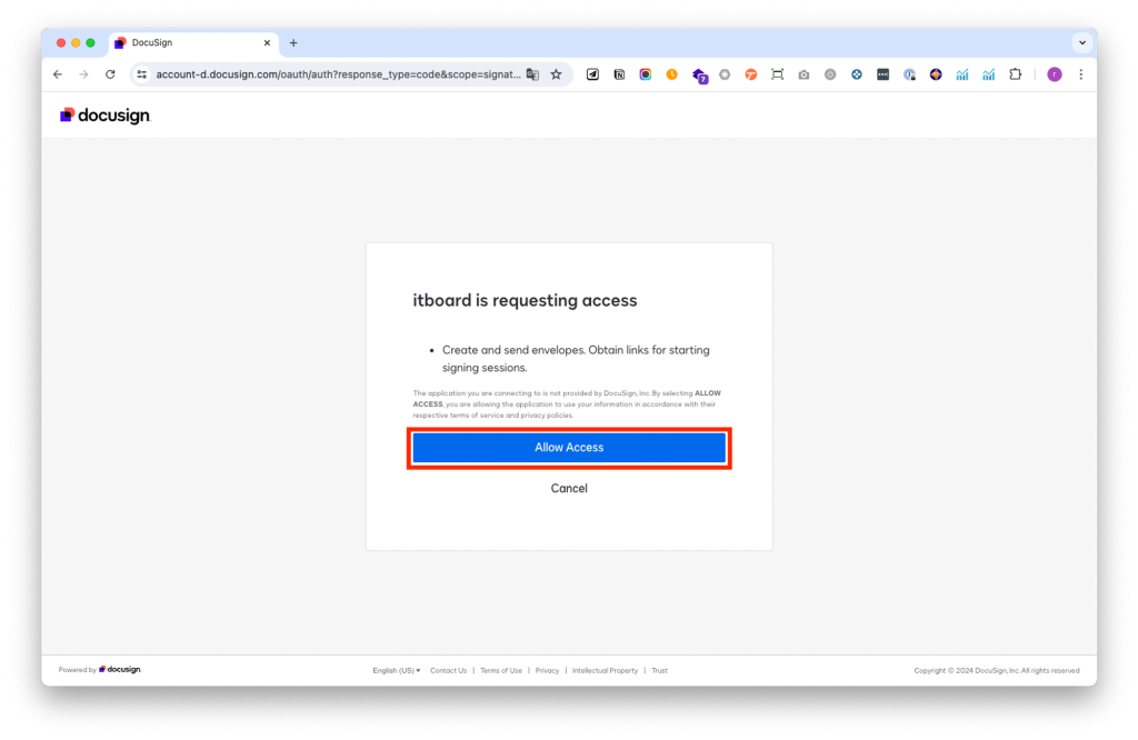 ITboardと連携しても良いかDocuSignの認可画面が表示されます。