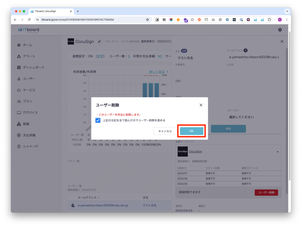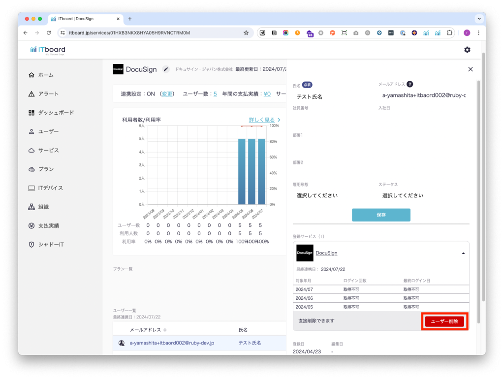 DocuSignのサービスパネルを見つけ、サービスパネルにある「ユーザー削除」ボタンをクリックします