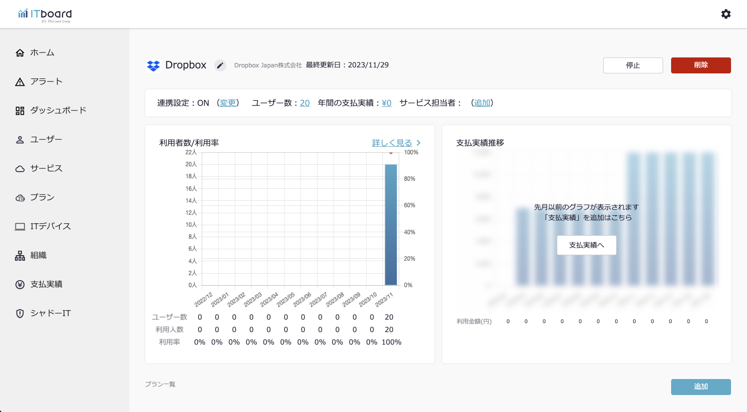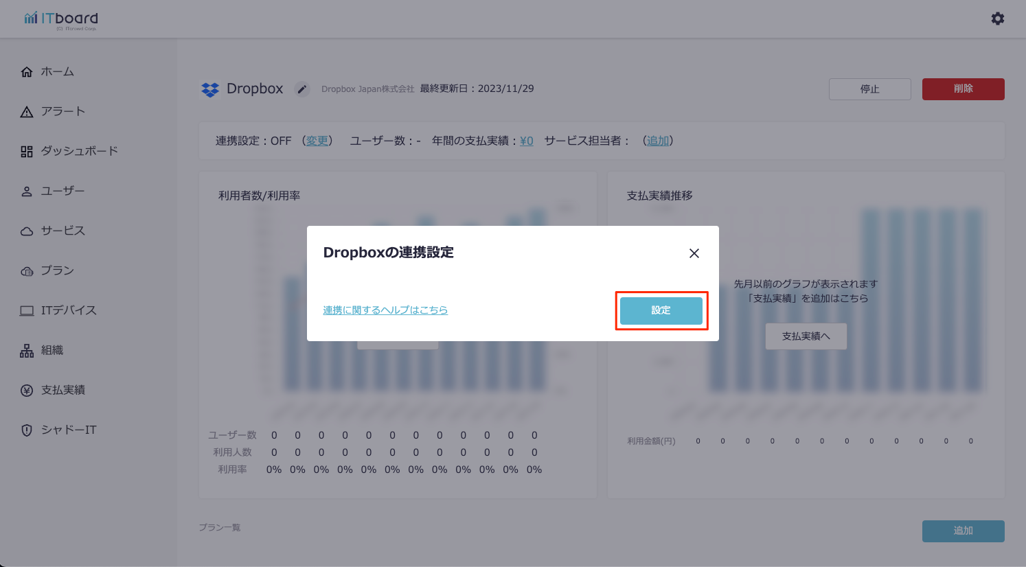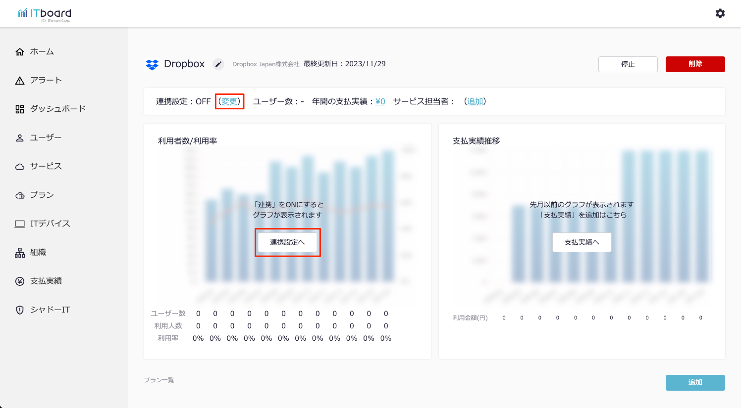 ITboardのサービス詳細画面に戻りますので、そこで「連携設定: ON」になり、「利用者数/利用率」のグラフが見られるようになっていれば、連携成功です。