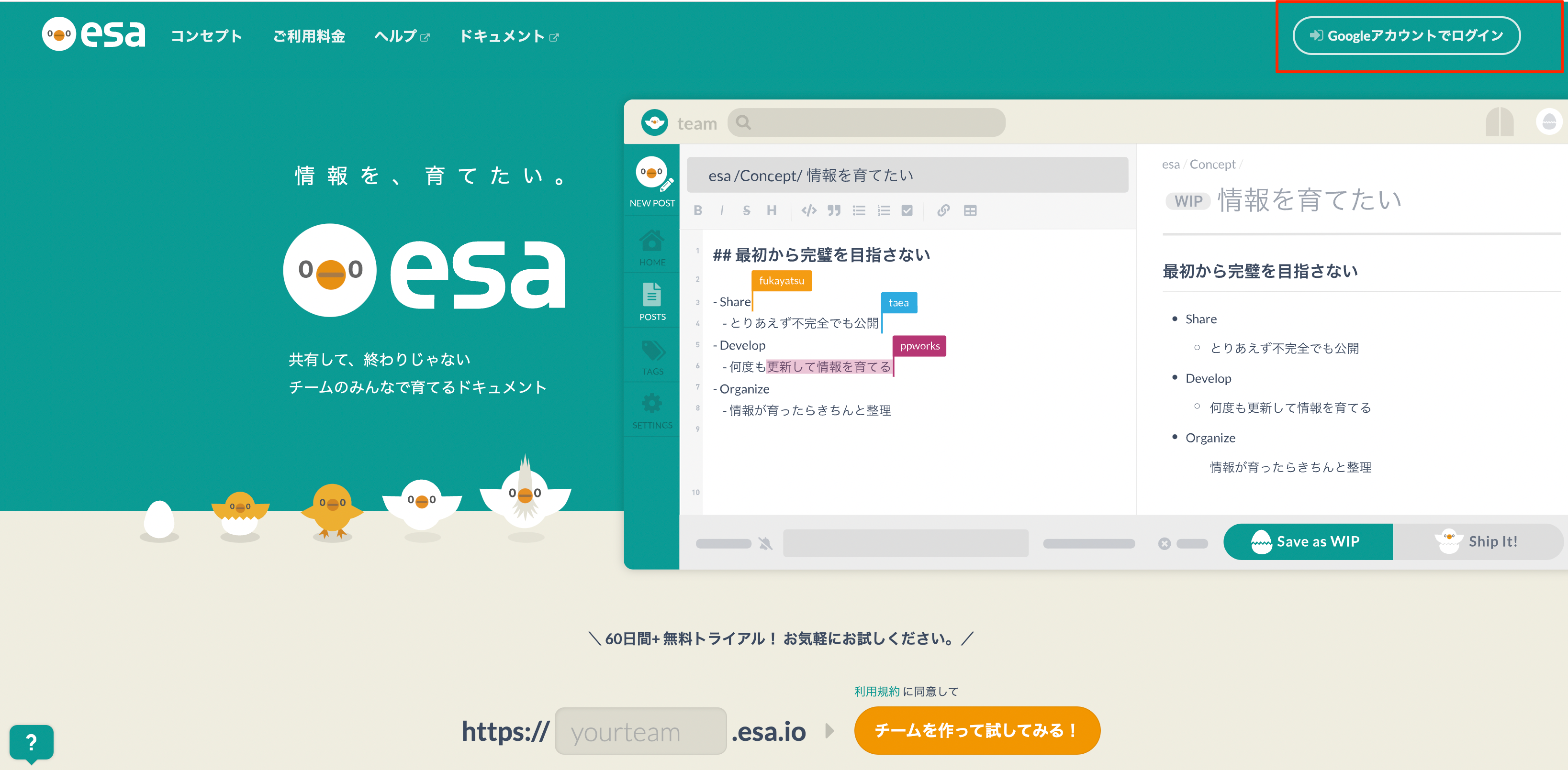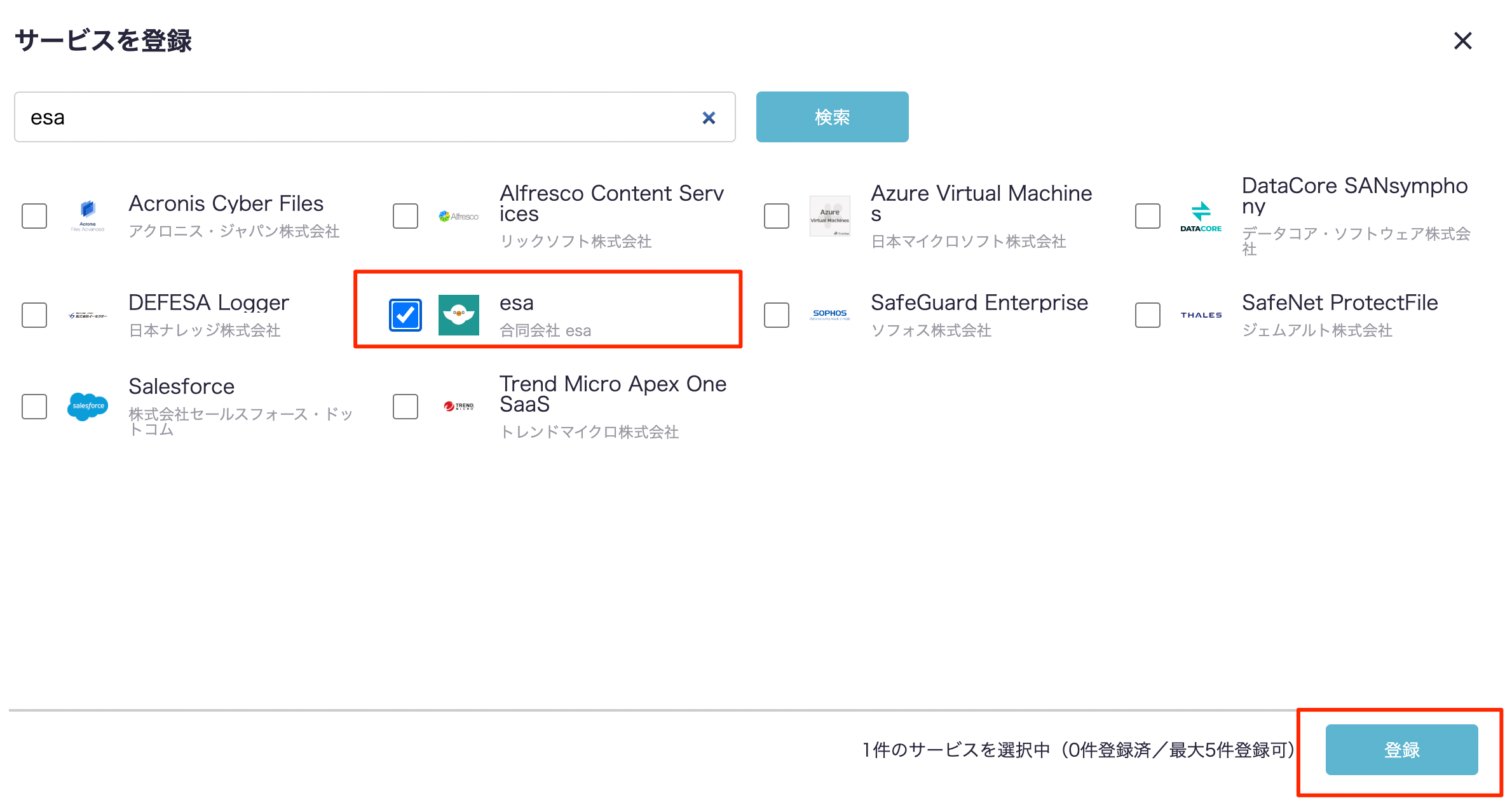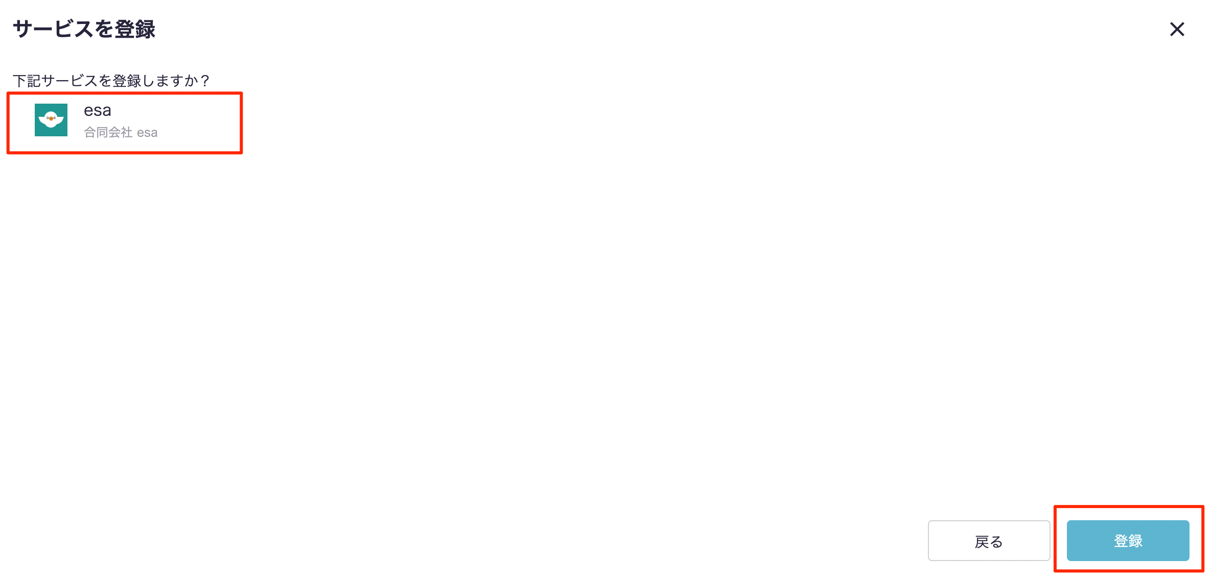 その後、下画像のようなモーダルが出現しますので、入力欄にサービス名である「esa」と入力します。