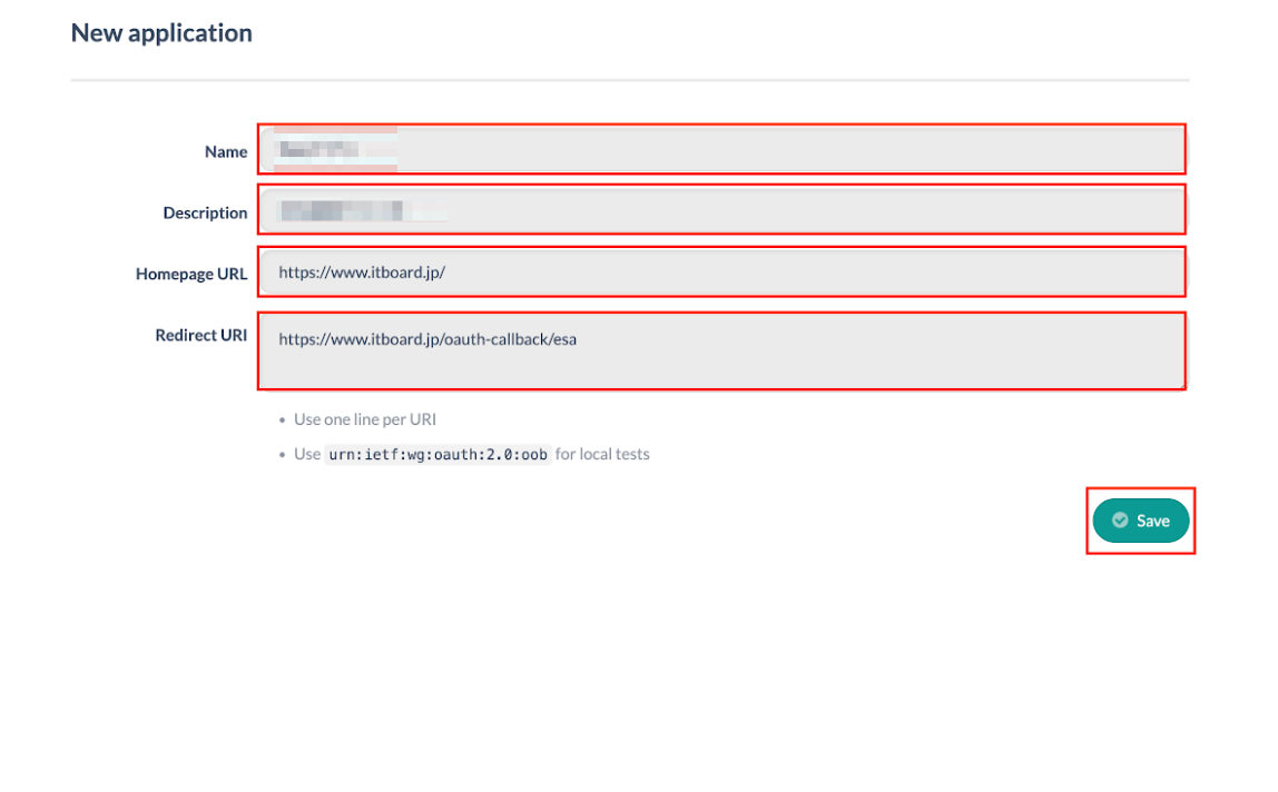 Redirect URIには『https://www.itboard.jp/oauth-callback/esa』を入力し、『Save』を押下します。