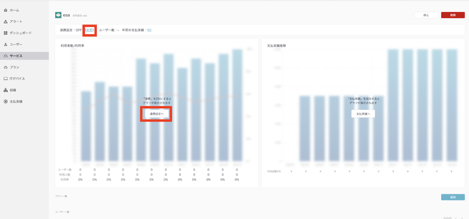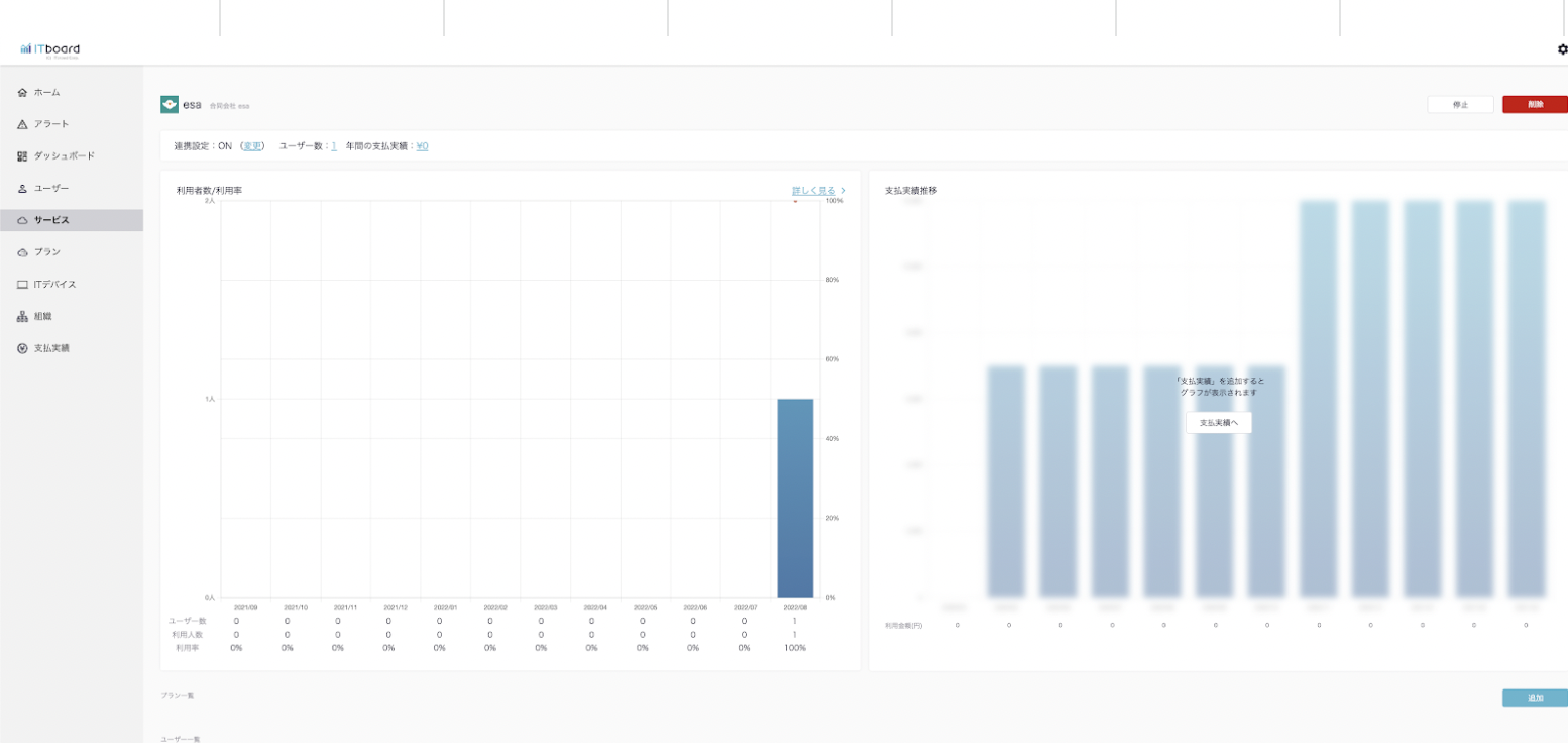 Tboardのサービス詳細画面に戻りますので、そこで「連携設定: ON」になり、「利用者数/利用率」のグラフが見られるようになっていれば、連携成功です。