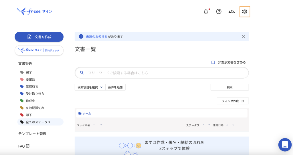 連携したいアカウントでfreeeサインへログインし、右上の『歯車アイコン』を押下します。