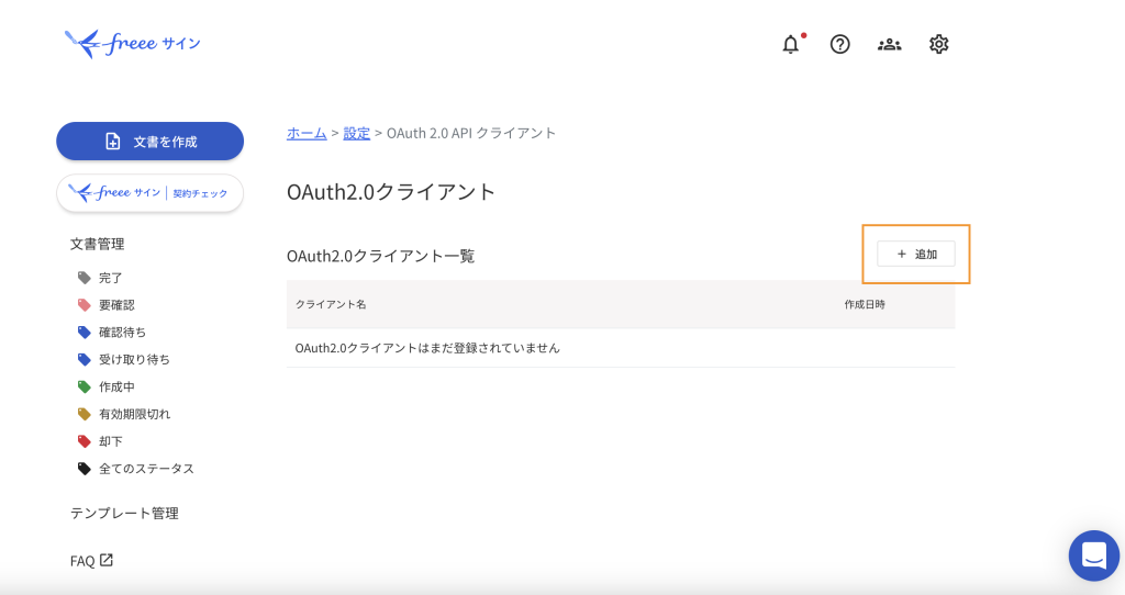 OAuth 2.0 API クライアント一覧画面の『+追加』を押下します。