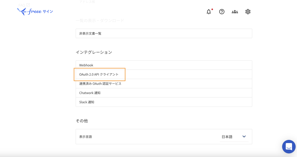 設定画面のインテグレーションの一覧から『OAuth 2.0 API クライアント』を選択します。