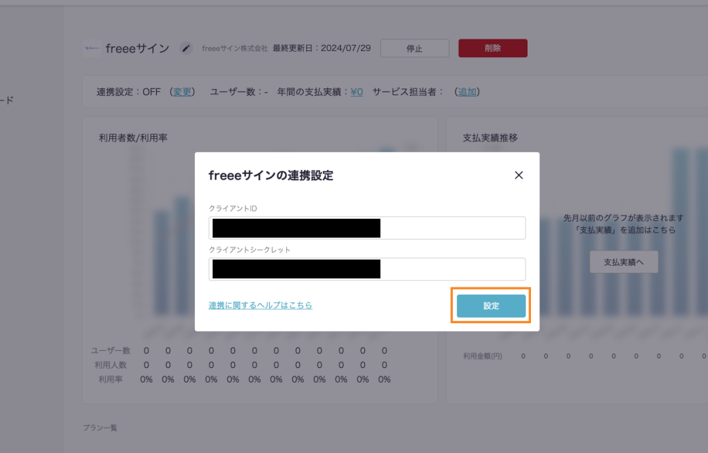 freeeサインの連携設定モーダルが出現するので、「client_id」と「client_secret」を入力し『設定』ボタンを押下します。