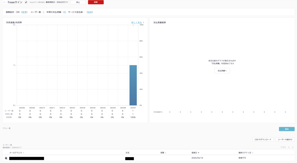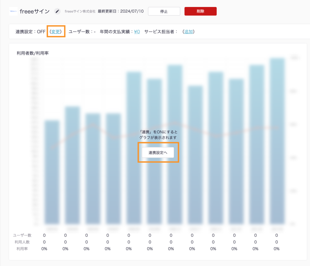 ITboardのサービス詳細画面に戻りますので、そこで「連携設定: ON」になり、「利用者数/利用率」のグラフが見られるようになっていれば、連携成功です。