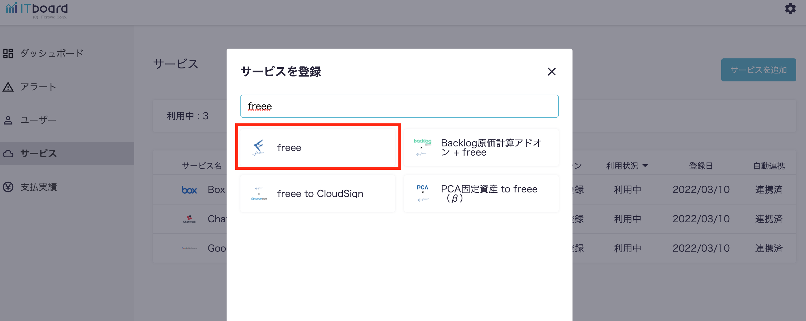サービス一覧画面に戻りますので、その中から『freee』を選択します。