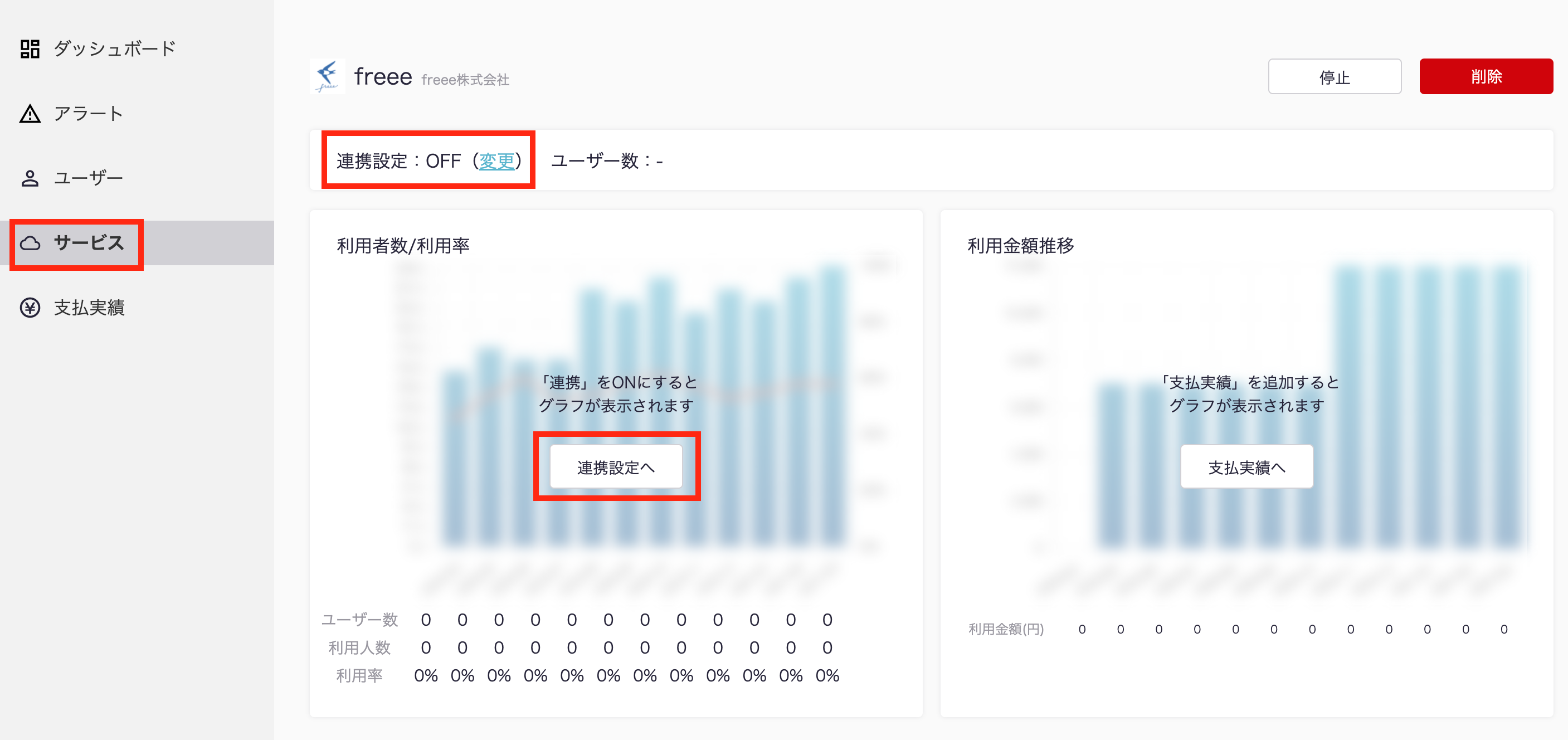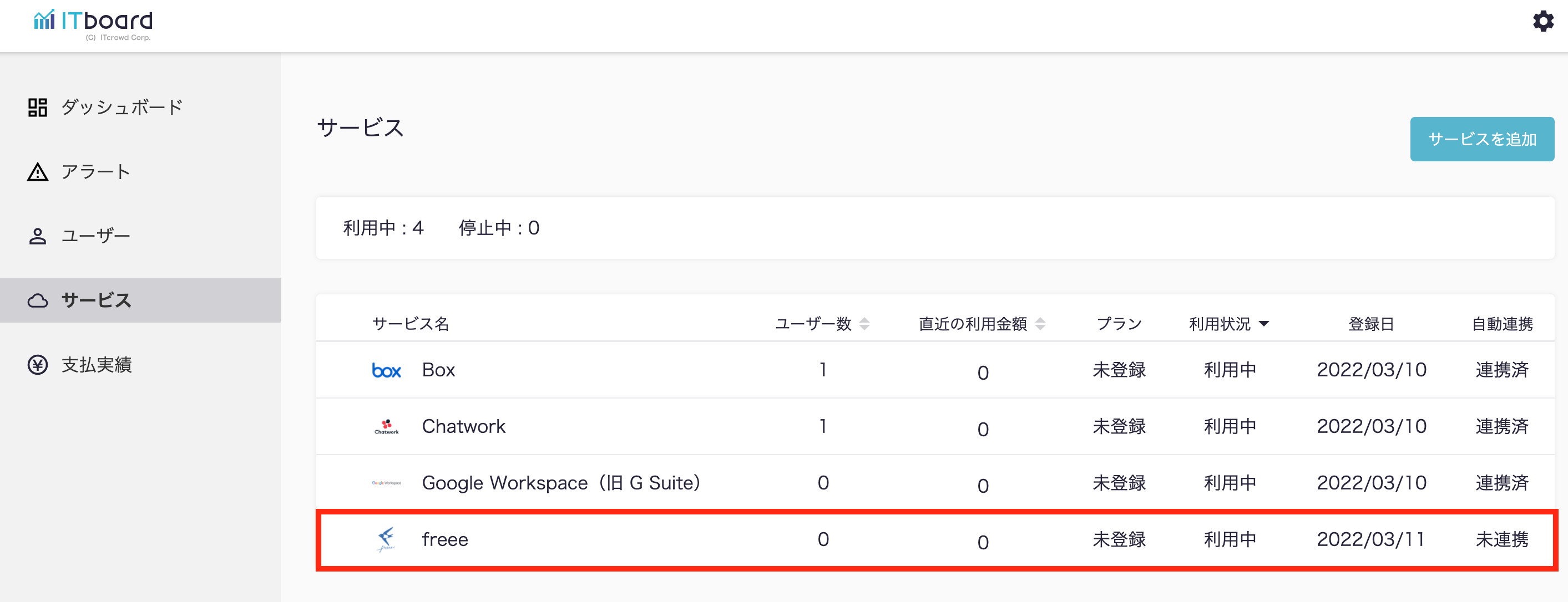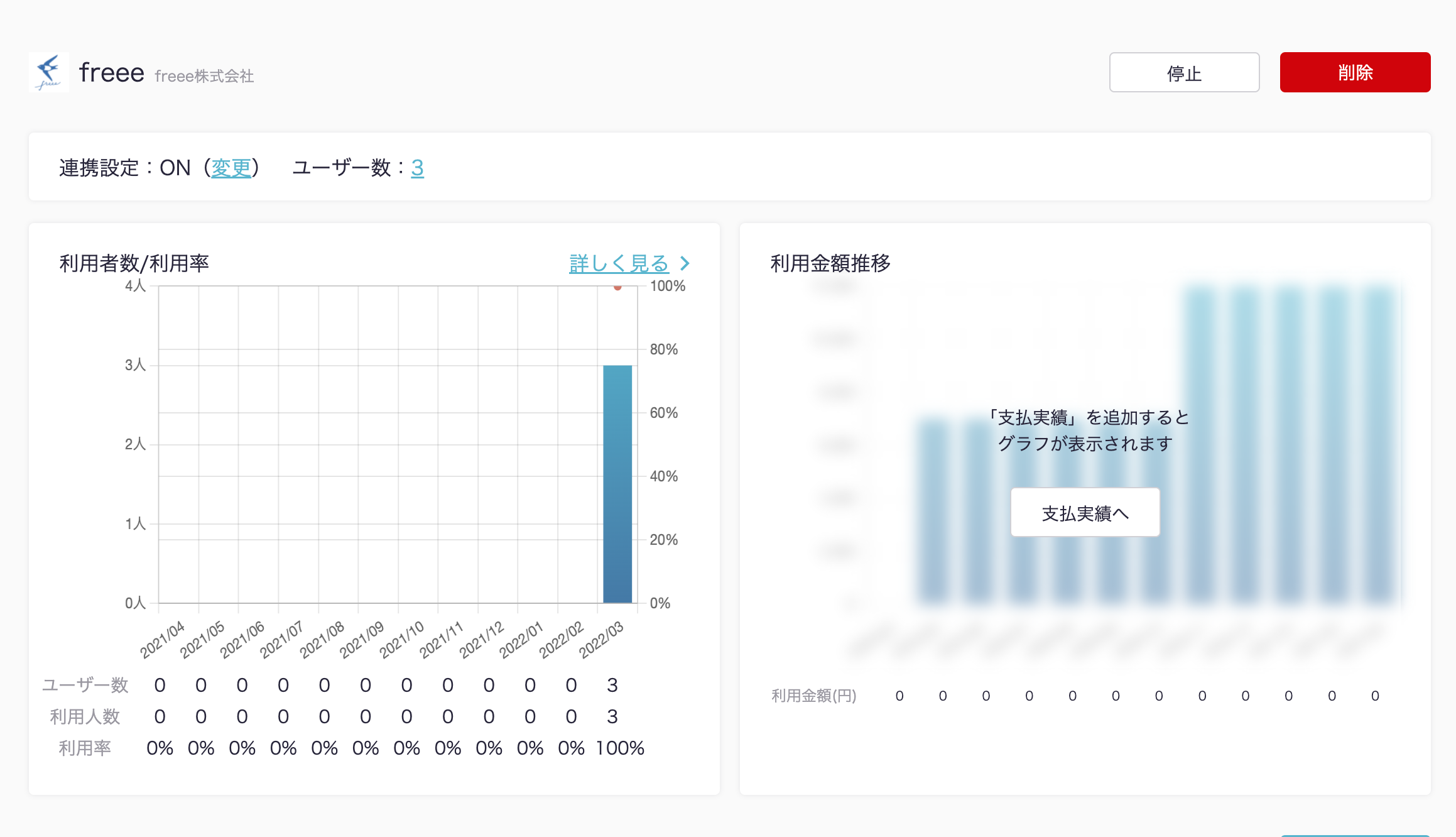 ITboardのサービス詳細画面に戻りますので、そこで「連携設定: ON」になり、「利用者数/利用率」のグラフが見られるようになっていれば、連携成功です。