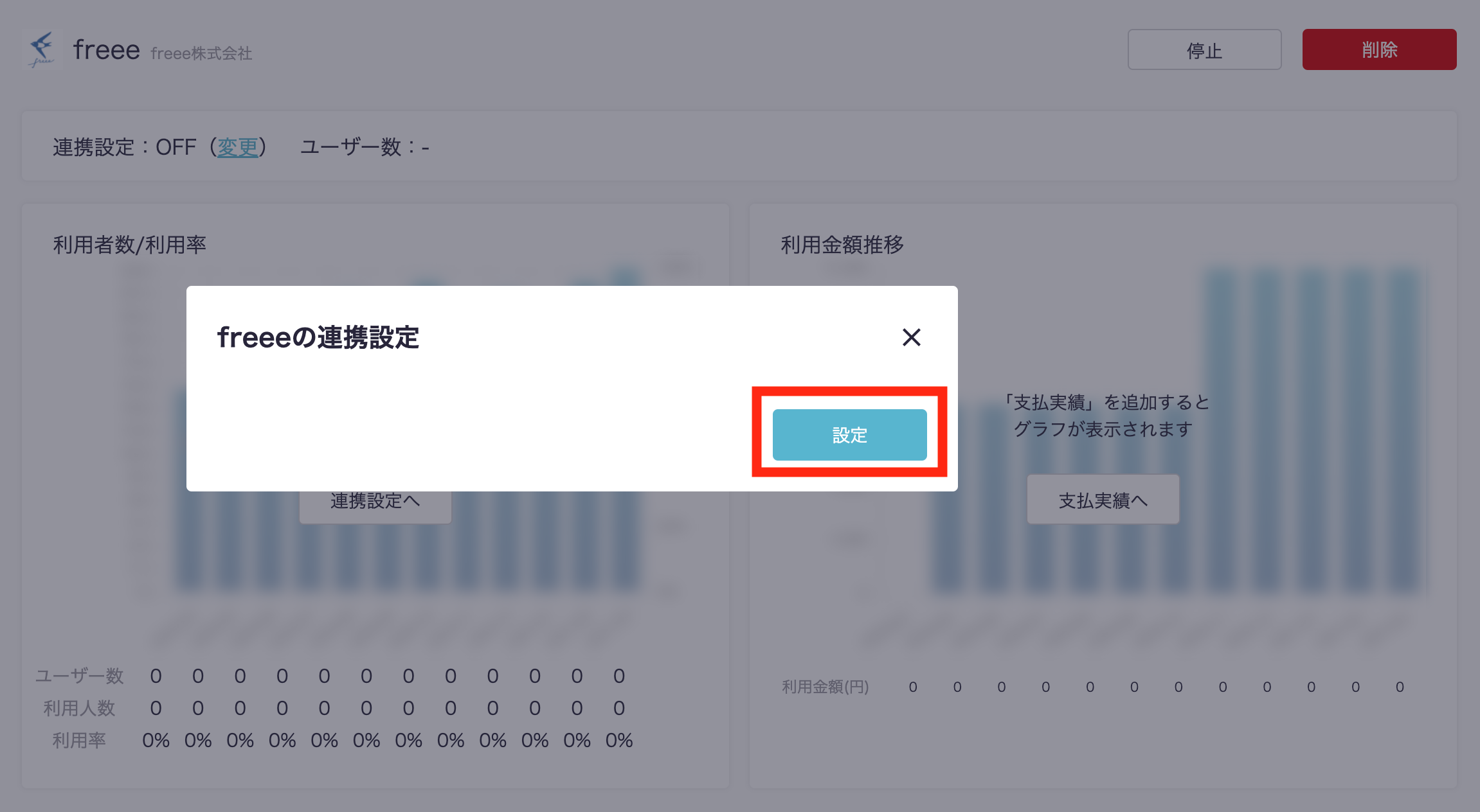 freeeの連携設定モーダルが出現するので、『設定』ボタンを押下します。