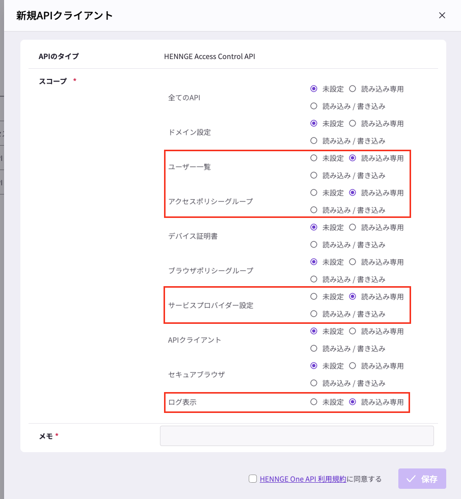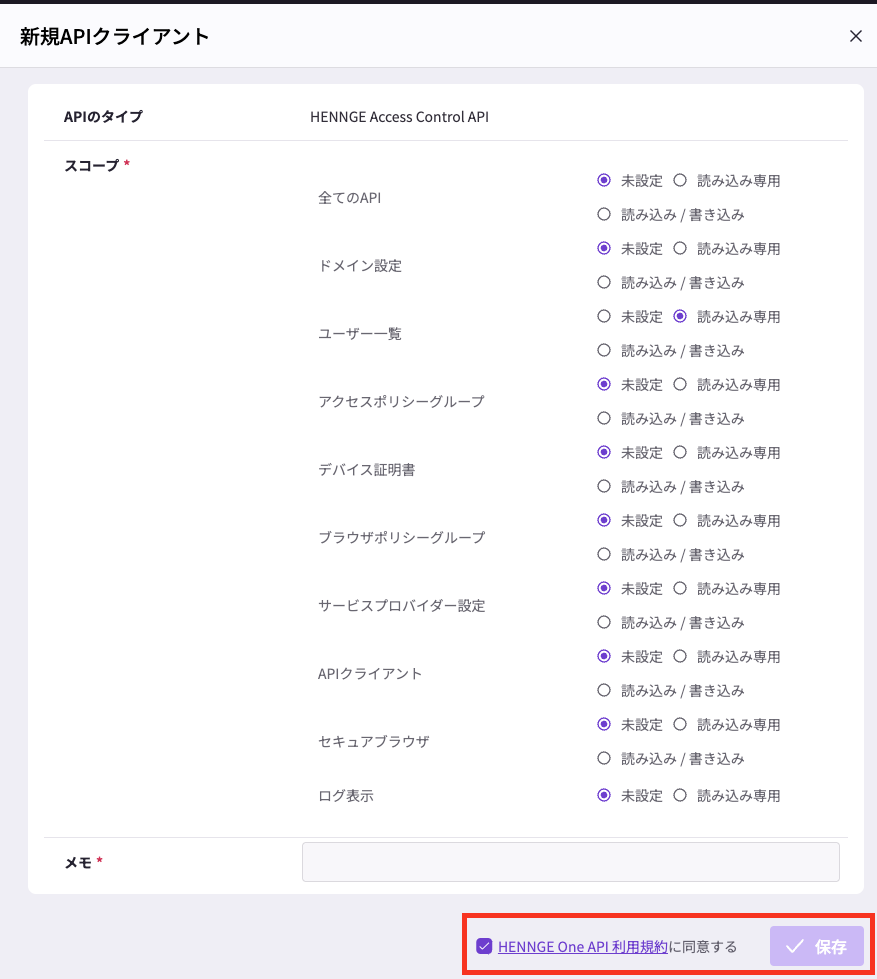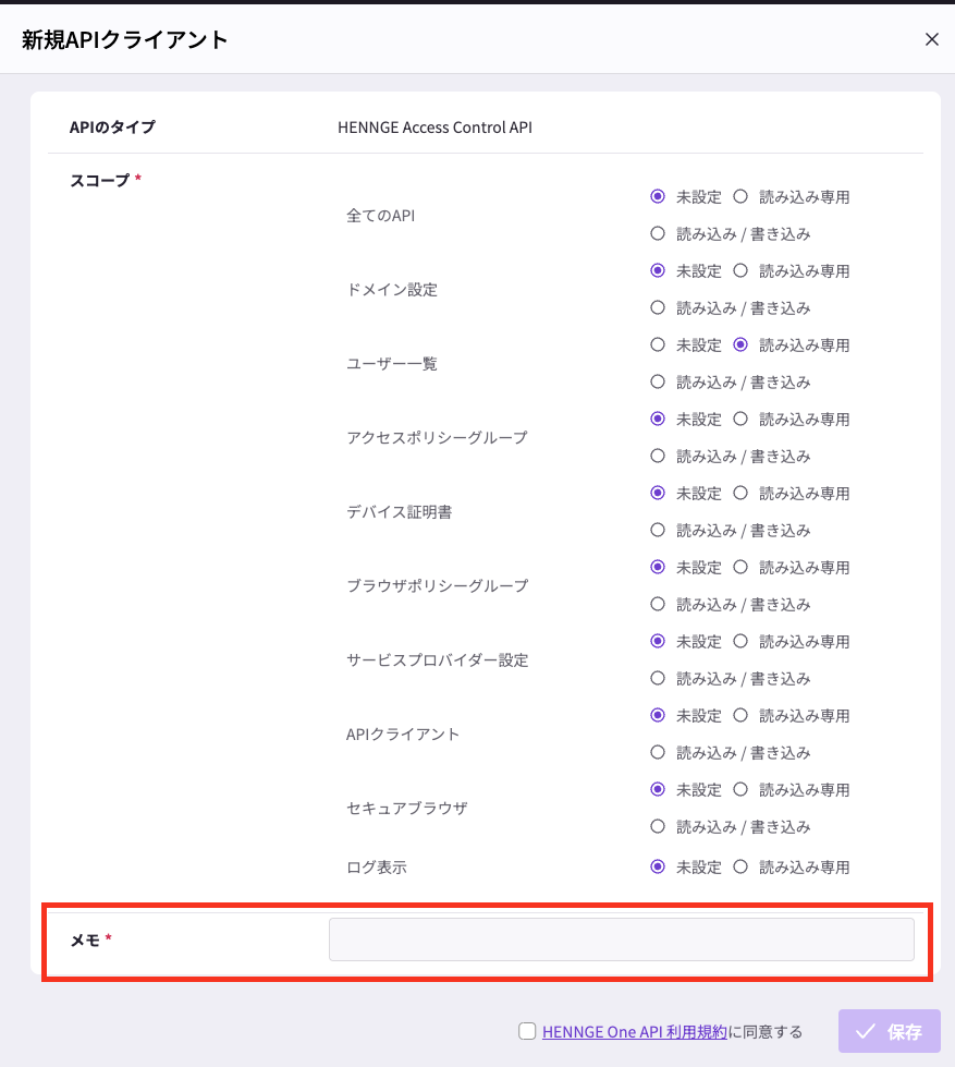「 HENNGE One API 利用規約に同意する」にチェックを入れ、「保存」をクリックします。