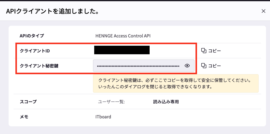 ※クライアントシークレット(クライアント秘密鍵)が表示されるのは1度のみです