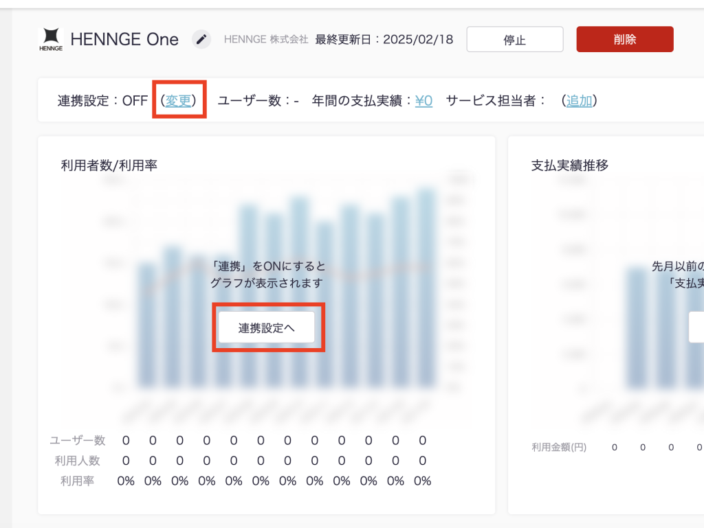 サービス詳細画面の、連携設定の『変更』リンク、または『連携設定へ』ボタンを押下します。