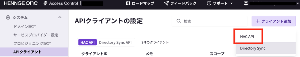 表示された選択肢から 「HAC API」 をクリックし、新規APIクライアント作成画面を開きます。