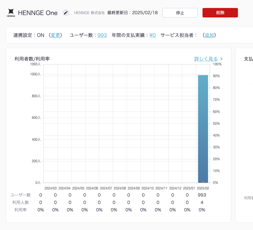 ITboardのサービス詳細画面に戻りますので、そこで「連携設定: ON」になり、「利用者数/利用率」のグラフが見られるようになっていれば、連携成功です。