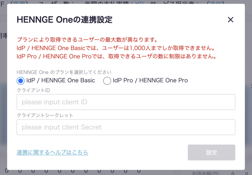 HENNGE One のプランを選択し、先ほど控えた「クライアントID」と「クライアントシークレット」を入力して「設定」ボタンを押下します。