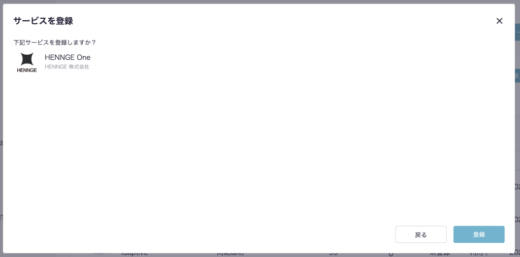 サイドメニューから『サービス』を選択し、『サービスを追加』ボタンを押下します。その後、モーダルが出現しますので、入力欄にサービス名である「HENNGE One」と入力します。出てきた検索結果から『HENNGE One』を選択します。