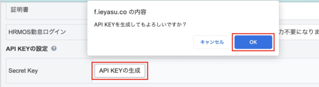 4. 「API KEYの設定」の項目において、「API KEY生成」ボタンをクリックし、表示されるポップアップメッセージで「OK」を押下する。