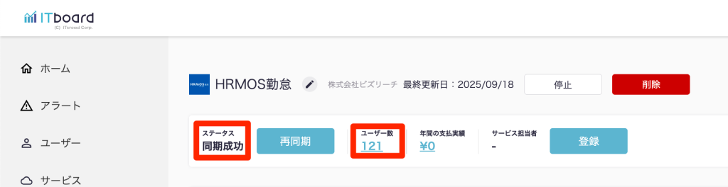 4. ステータスが「同期成功」になり、HRMOS勤怠の連携設定が完了する。