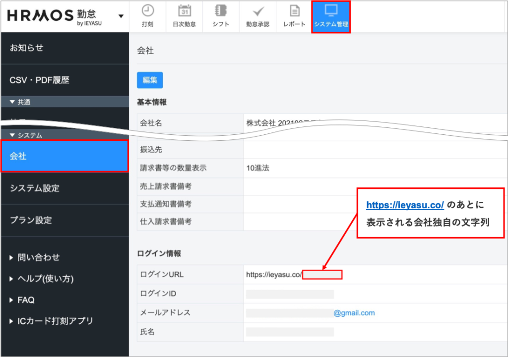 [システム管理>会社]画面の「ログインURL」から確認したURLでログイン