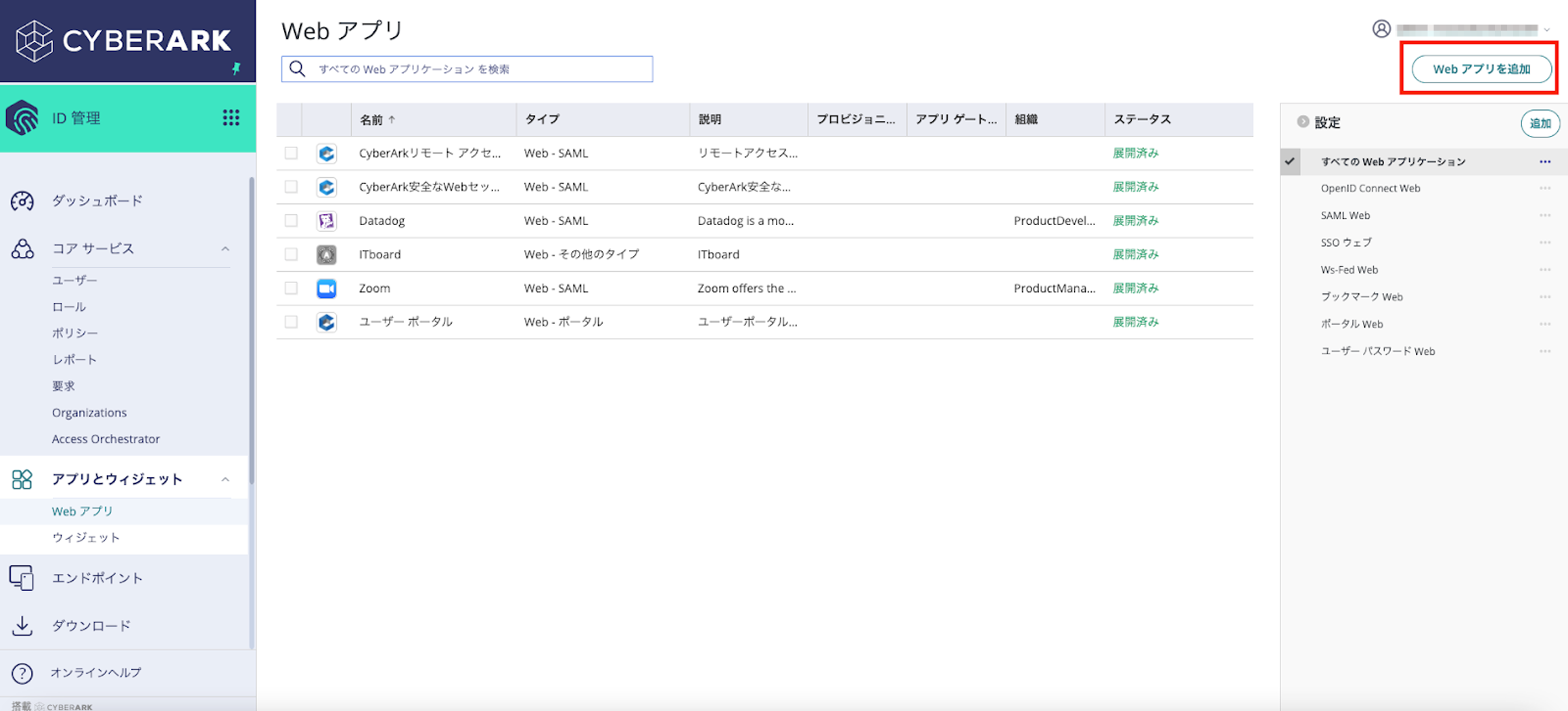 「Webアプリ」の画面にて、右上の[Webアプリを追加]をクリックします。