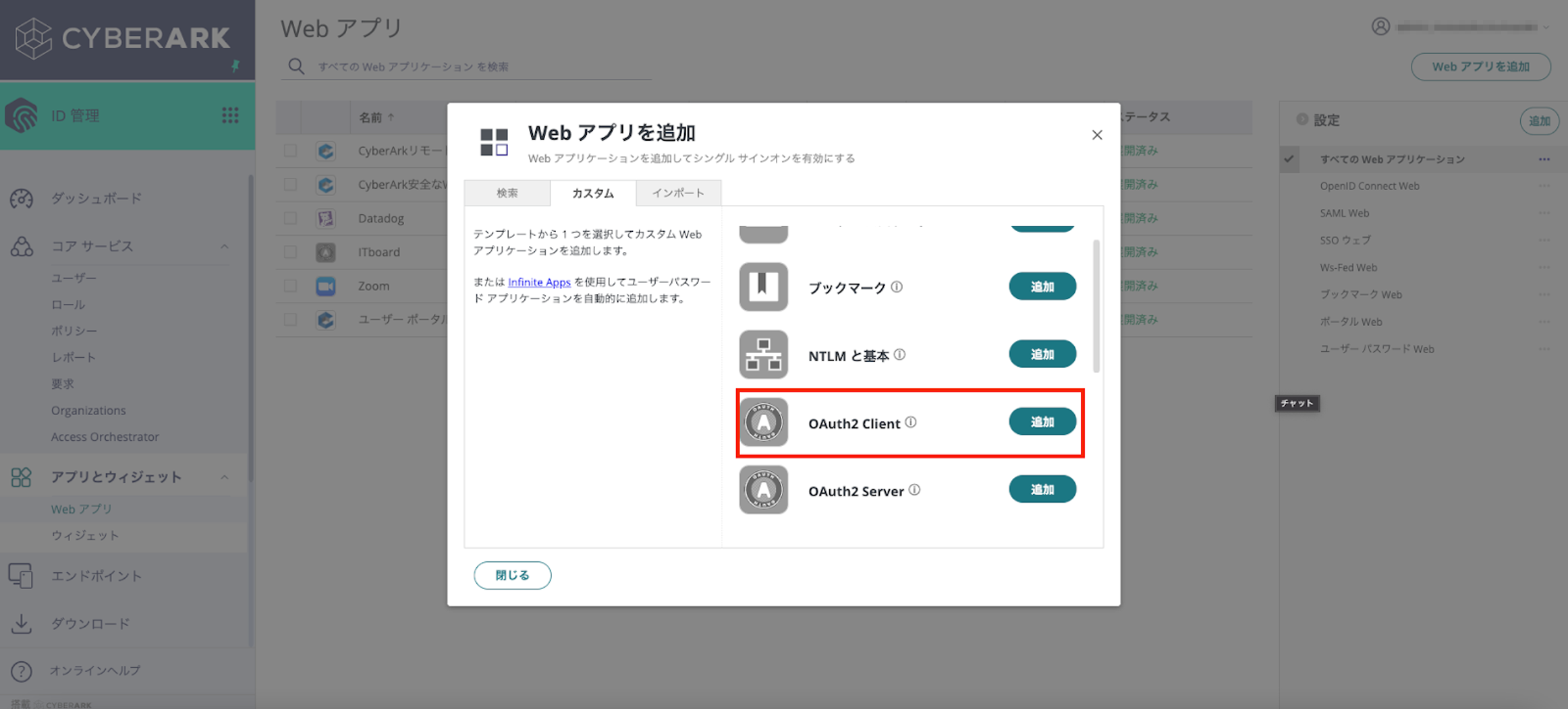 表示されたモーダルにて[カスタム]タブを選択し、「Oauth2 Client」の[追加]をクリックします。