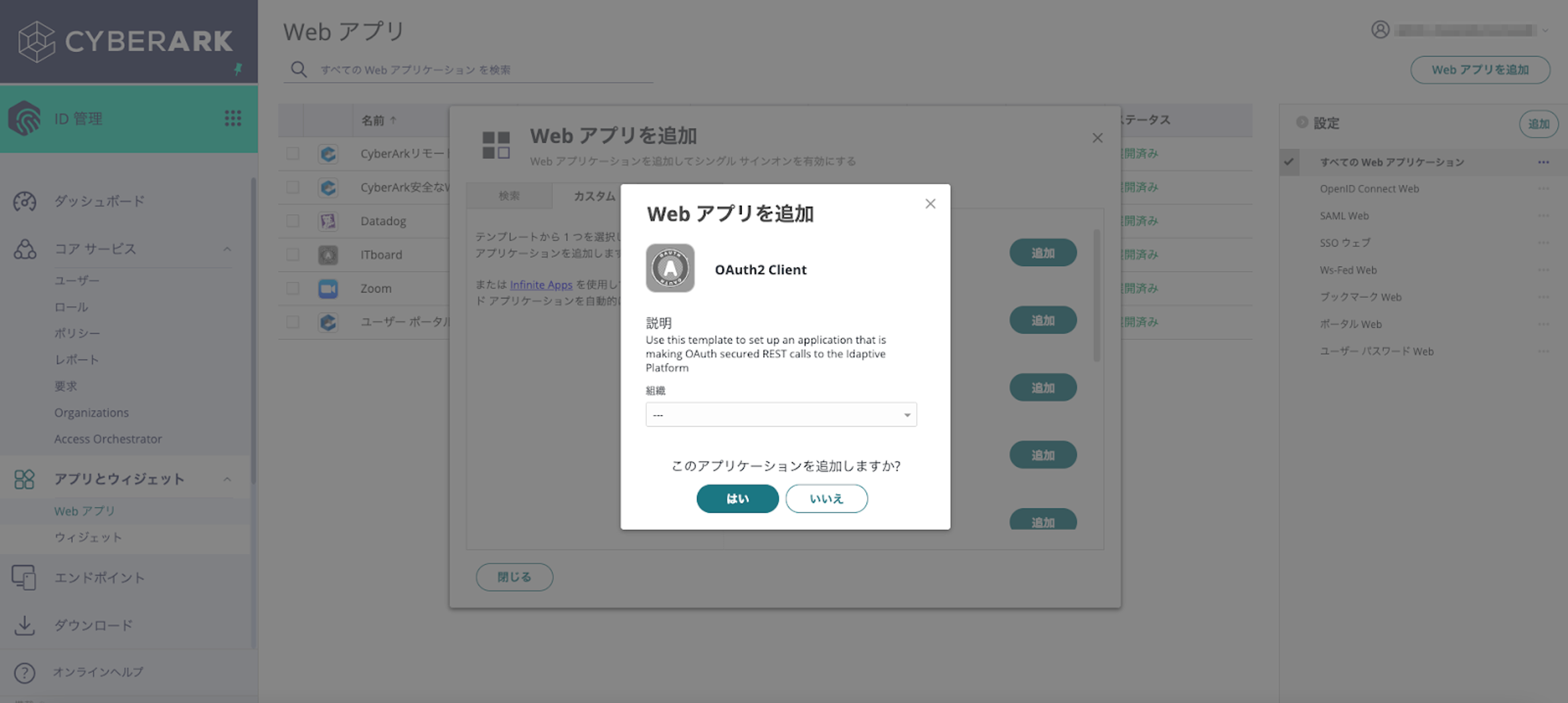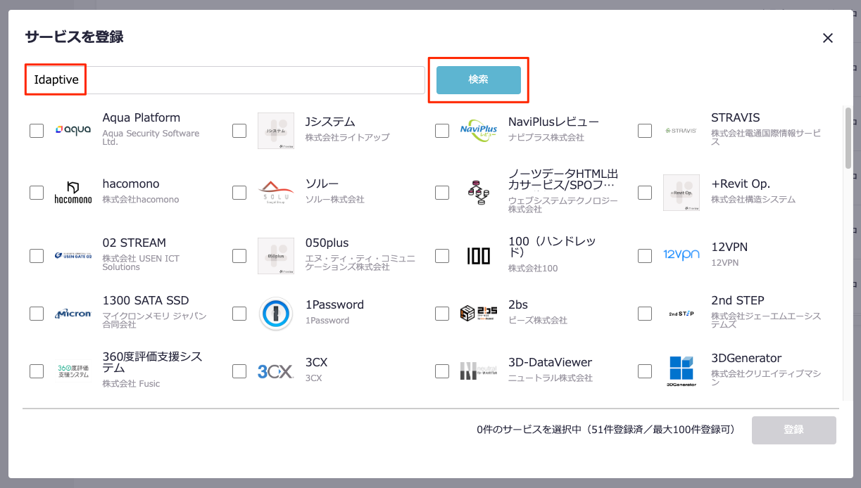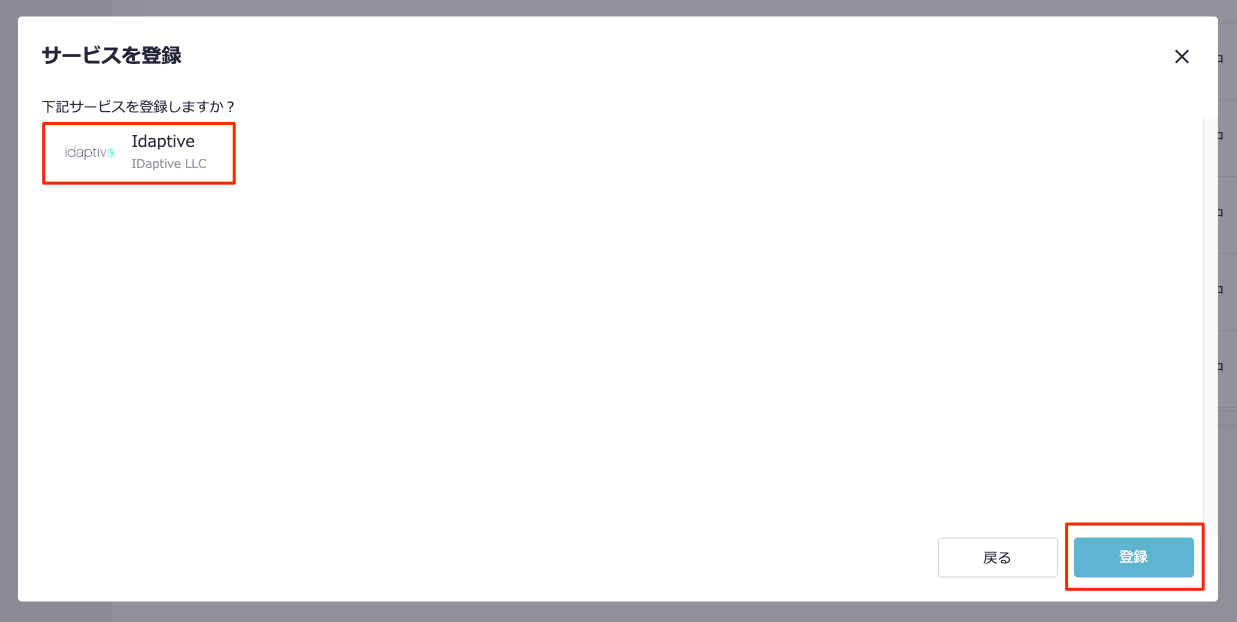 その後、上記画像のようなモーダルが出現しますので、入力欄にサービス名である”Idaptive”と入力します。