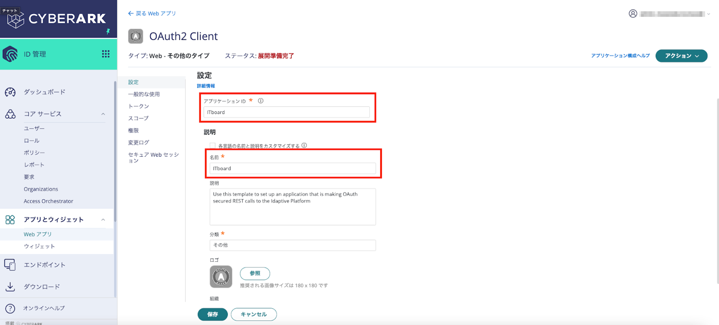 アプリ詳細画面にて「アプリケーションID」「名前」に、”ITboard”を入力して保存します。