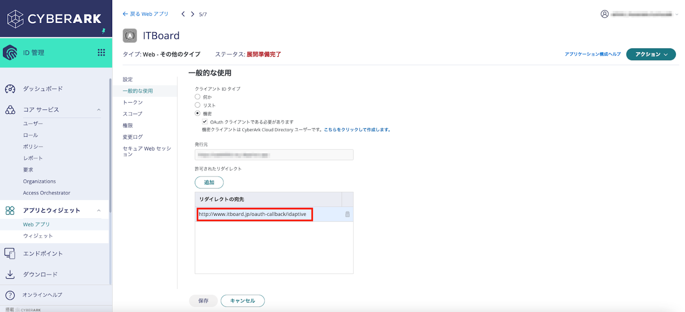 Webアプリの左メニューから[一般的な使用]をクリックし、リダイレクトの宛先として”https://www.itboard.jp/oauth-callback/idaptive”を追加して保存します。