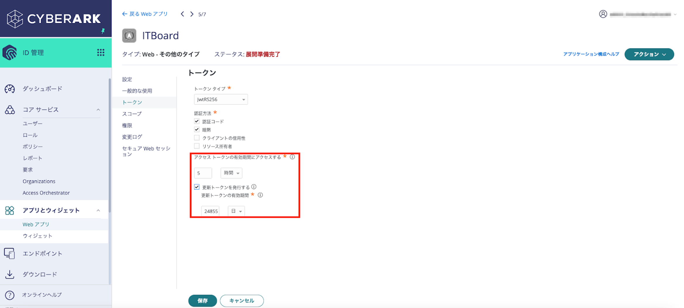 Webアプリの左メニューから[トークン]をクリックしたのち[更新トークンを発行する]をチェックし、更新トークンの有効期間を24855日に設定して保存します。