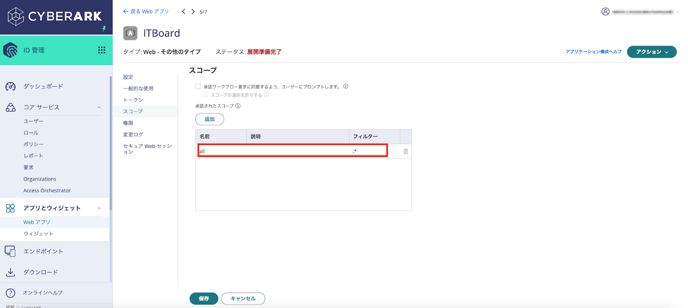 Webアプリの左メニューから[スコープ]をクリックし、「名前:all、フィルター:.*」のスコープを追加して保存します。