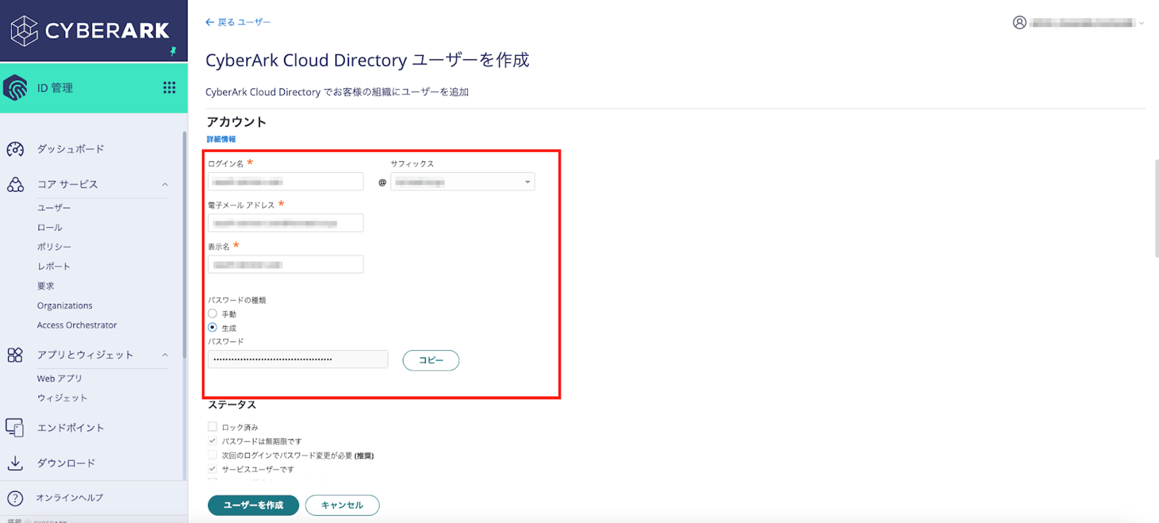 「ログイン名」「電子メールアドレス」「表示名」を入力し、生成されたパスワードをコピーしておきます。
