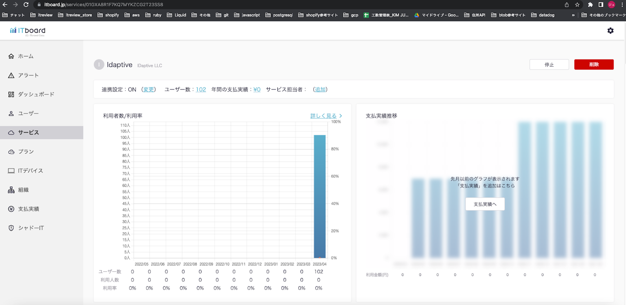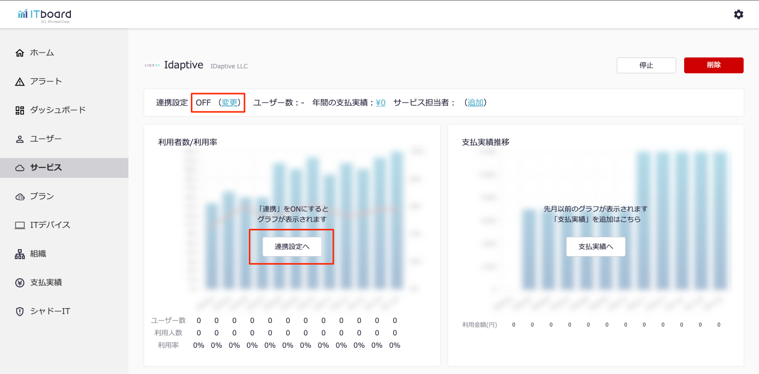 ITboardのサービス詳細画面に戻りますので、そこで「連携設定: ON」になり、「利用者数/利用率」のグラフが見られるようになっていれば、連携成功です。