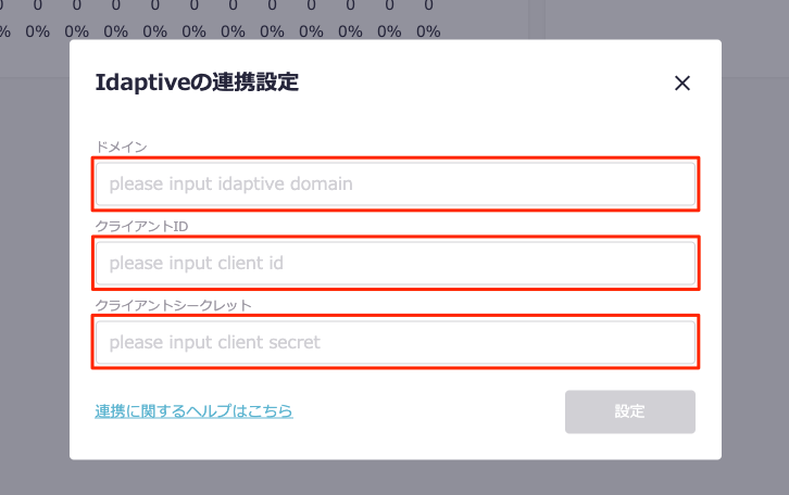 Idaptiveの連携設定モーダルが出現するので「ドメイン」「クライアントID」「クライアントシークレット」を入力し、設定ボタンをクリックします。