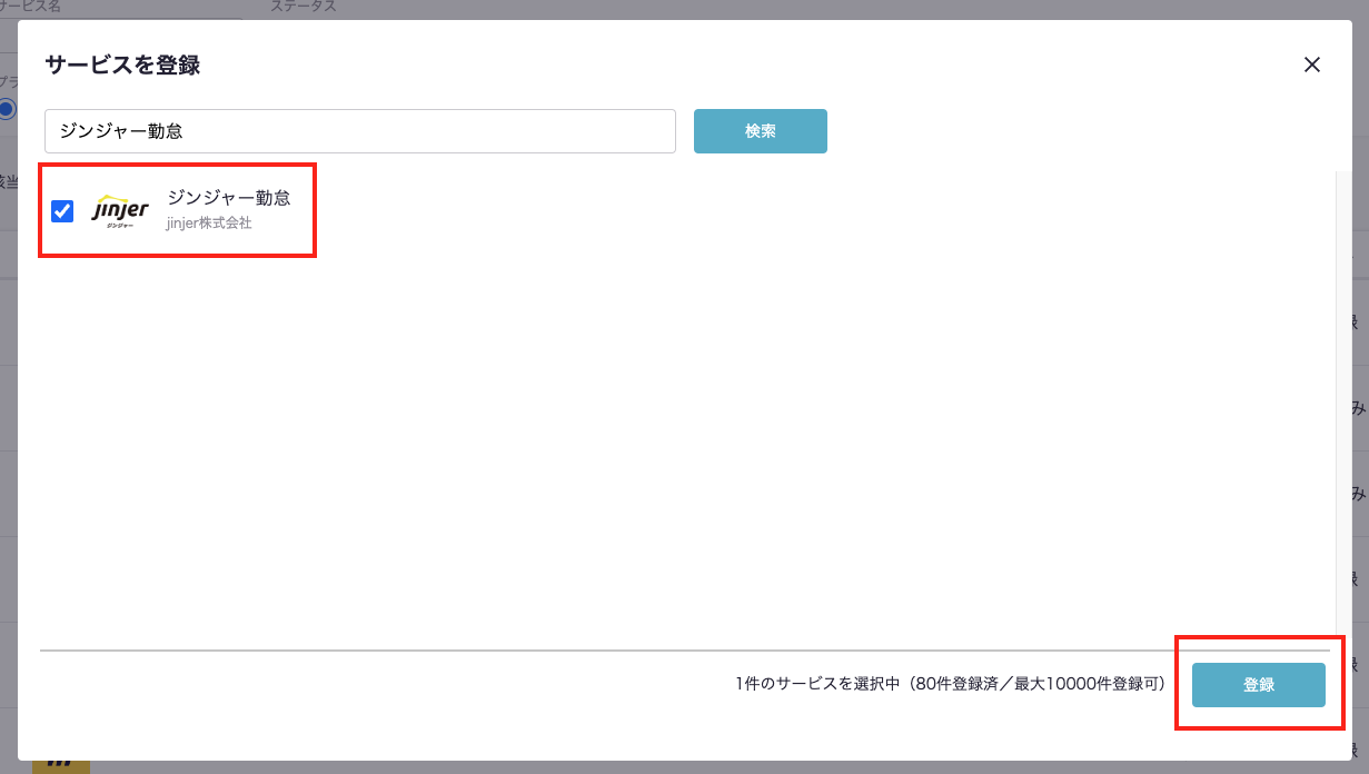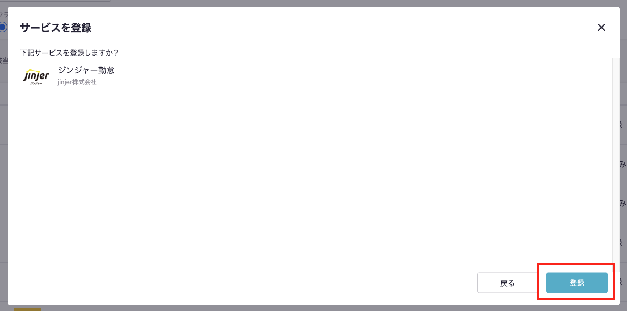 その後、下画像のようなモーダルが出現しますので、入力欄にサービス名である「ジンジャー勤怠」と入力します。